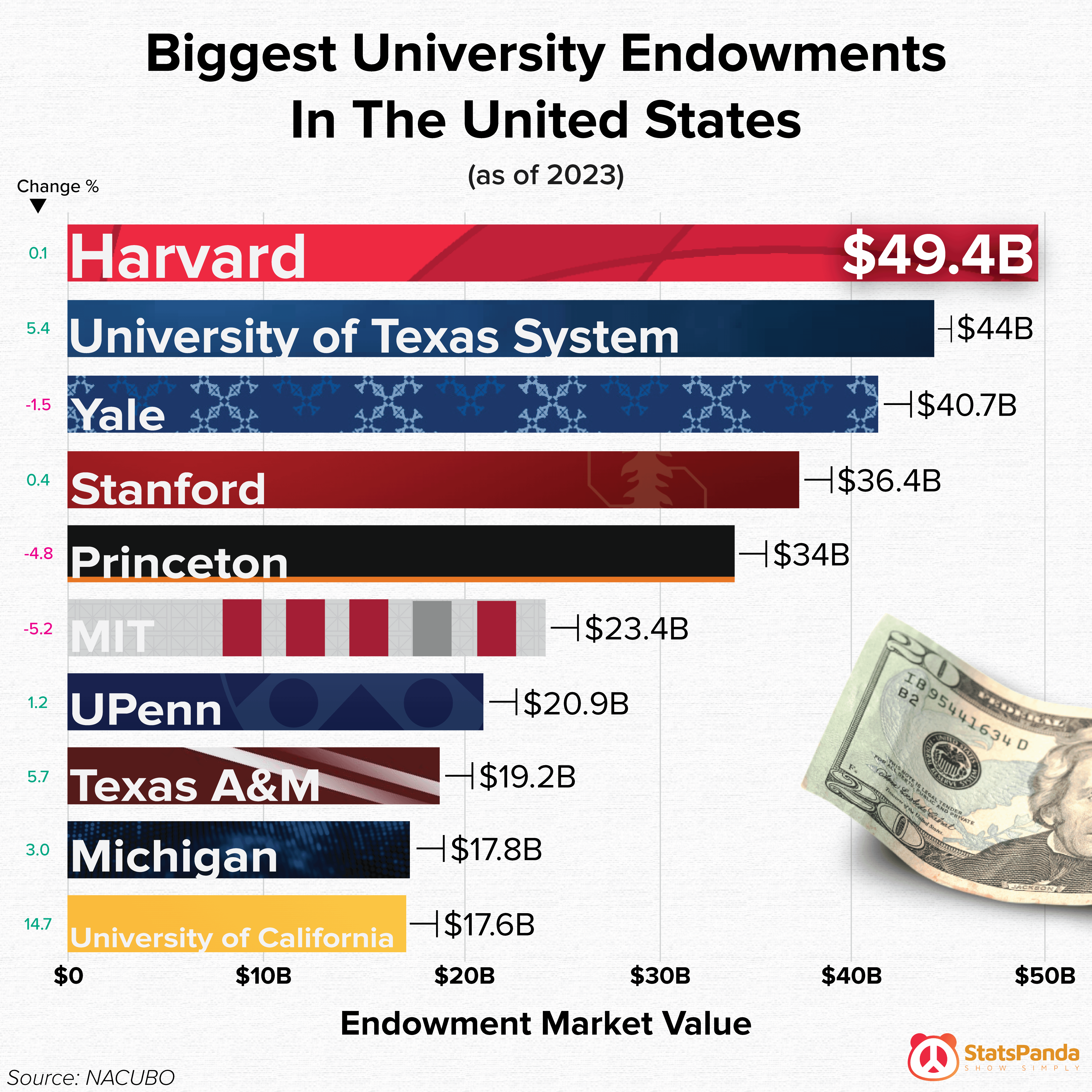 ![OC] Biggest University Endowments In The United States : r/dataisbeautiful OC] Biggest University Endowments In The United States : r/dataisbeautiful](https://substackcdn.com/image/fetch/$s_!Z51d!,w_1456,c_limit,f_auto,q_auto:good,fl_progressive:steep/https%3A%2F%2Fsubstack-post-media.s3.amazonaws.com%2Fpublic%2Fimages%2F2e3c04d2-51f3-4e54-b7e9-2d3629a4eab4_4500x4500.png)