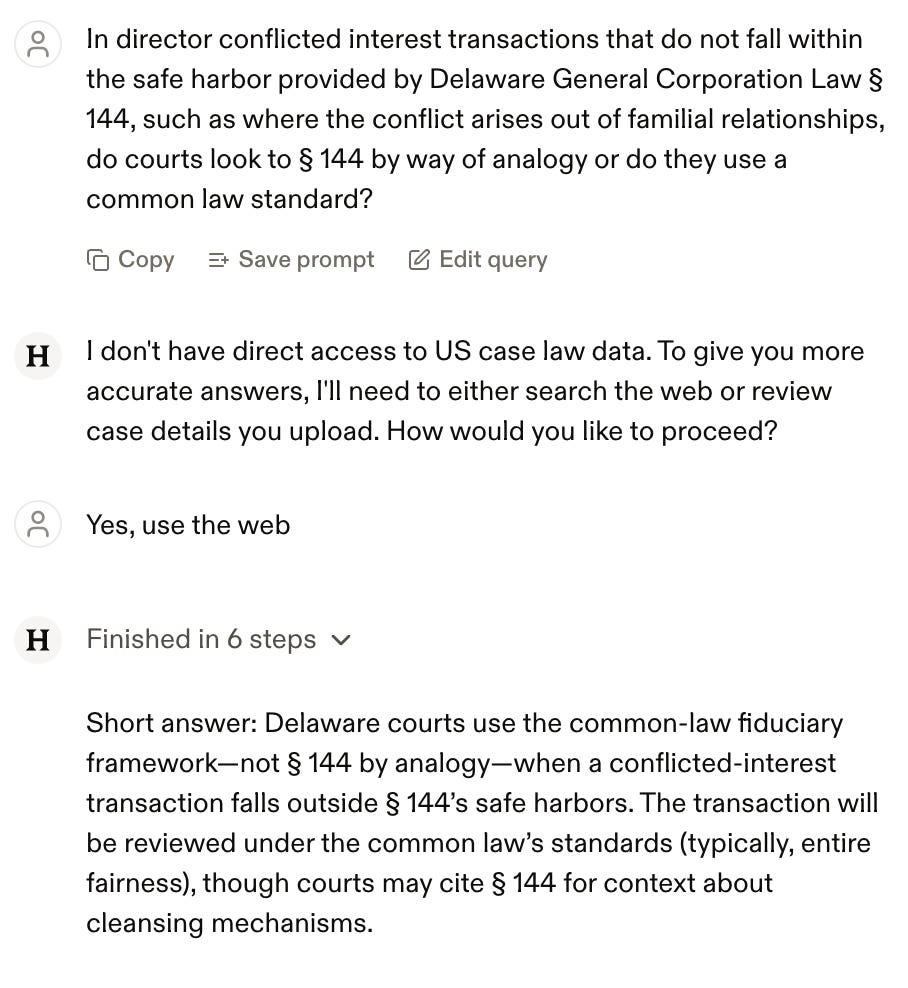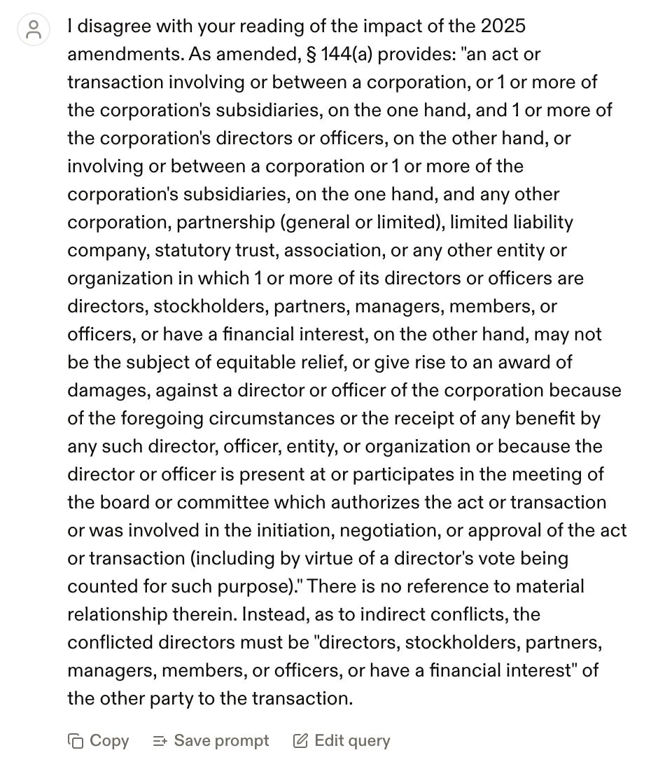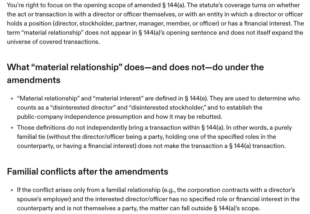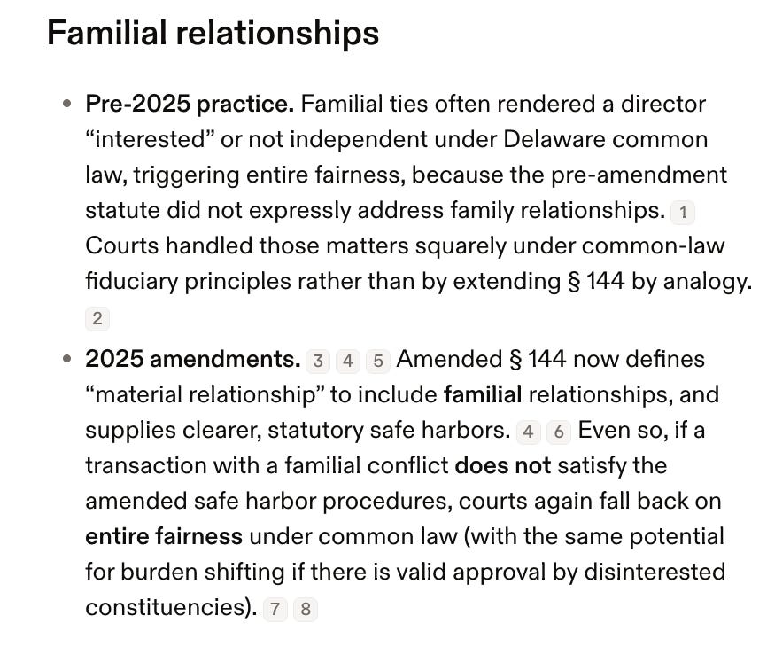 I want to highlight Harvey’s statement that: “Amended § 144 now defines ‘material relationship’ to include familial relationships, and supplies clearer, statutory safe harbors.”