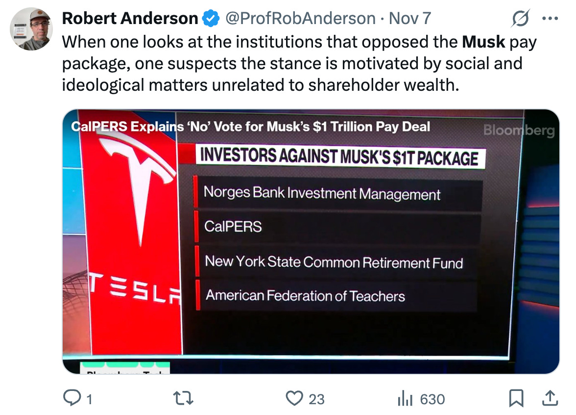 On the one hand, shouldn’t funds vote the way the investors want? On the other, Tesla stans are not the only investors in the fund, and if Schwab believes the pay package is bad for the fund overall, shouldn’t those other investors be protected?