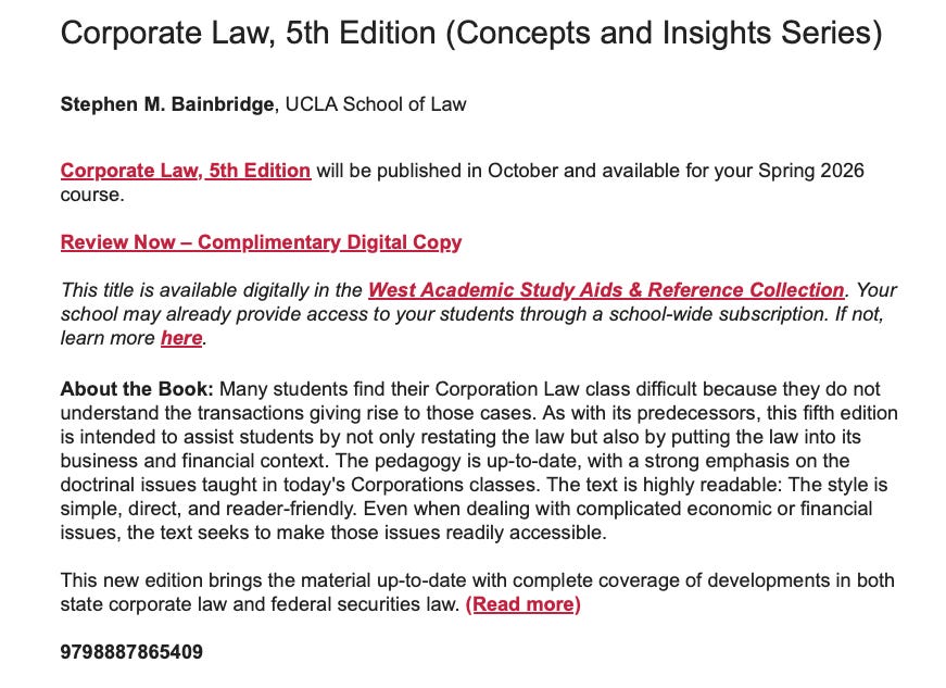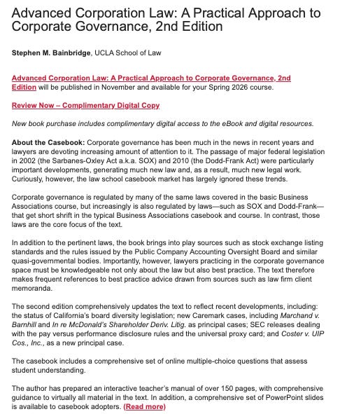 You can order a copy of Advanced Corporation Law (Second) from Foundation from this webpage. Law faculty can order an examination copy. This is more of a textbook than a casebook. It’s designed to be useful as a reference tool as well as a teaching tool. So it likely will be useful to lawyers and judges, as well as law students.