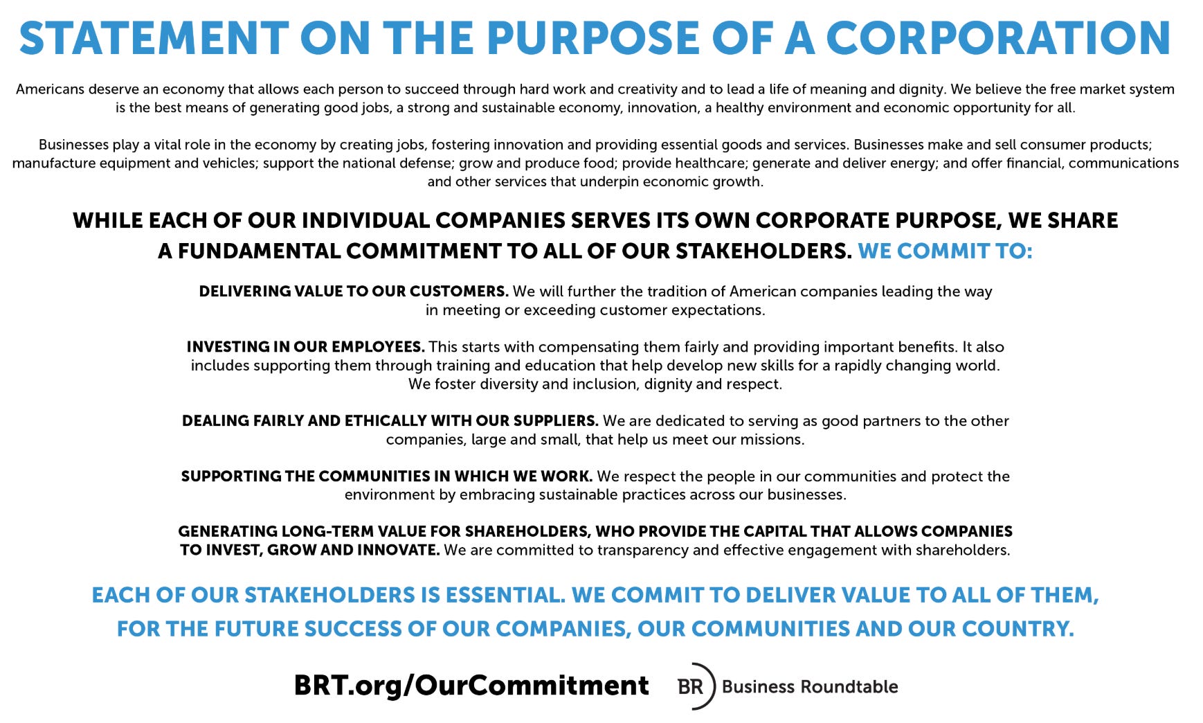 Back in 2019 the Business Roundtable—a lobbying association of 200+ CEOs of large US corporations—issued a manifesto on corporate purpose that purported to embrace a stakeholder/ESG approach to corporate governance. The usual suspects seized on the announcement as a transformational moment in which capitalist lions were finally laying down with labor and environmental lambs. They foretold a social justice utopia in which business would be responsible to society and stakeholders rather than just to shareholders.