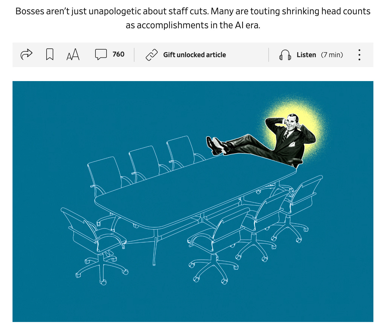 I was reminded of the BRT statement by an article in today’s WSJ, CEOs Are Shrinking Their Workforces—and They Couldn’t Be Prouder.