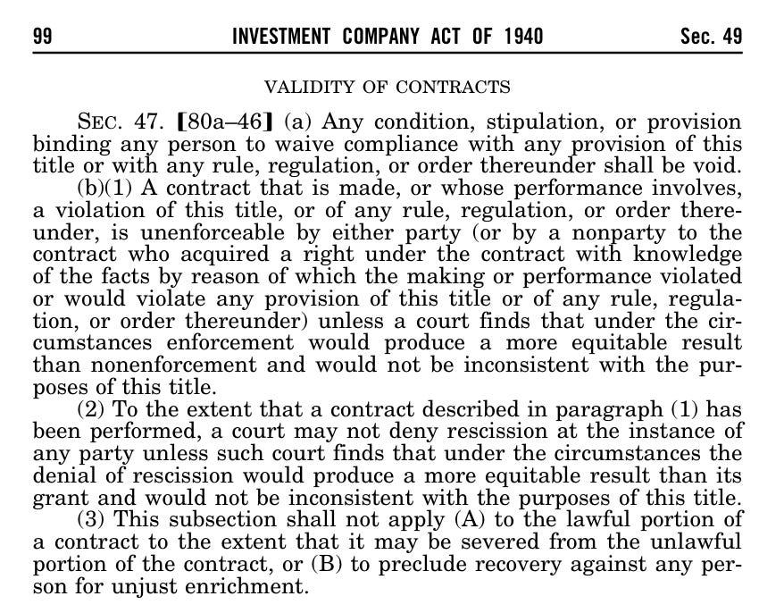 In FS Credit Opportunities, an activist hedge fund used Section 47(b) to challenge anti-takeover measures adopted by several closed-end funds organized under Maryland law. Each fund’s board of directors had adopted a resolution opting into the Maryland Control Share Acquisition Act, which limits the voting rights of shares obtained by a controlling shareholder over a certain threshold. The activist hedge fund sought to have those board resolutions rescinded so that the activist could take a controlling interest in the funds. The activist contended that the board resolutions violated Section 18(i) of the 1940 Act, which generally requires that each share of a registered fund “have equal voting rights.” 15 U.S.C. § 80a-18(i). Since Section 18(i) does not itself provide for a private right of action, the activist filed its action in the U.S. District Court for the Southern District of New York (which is within the Second Circuit and therefore bound by Second Circuit precedent) and asserted a cause of action under Section 47(b). Although Section 47(b) permits rescission only of contracts, the activist’s theory was that the board resolutions affected the contractual relationship between each fund and its shareholders. The closed-end funds argued that Section 47(b) did not provide a private right of action and that the board resolutions did not violate Section 18(i).3