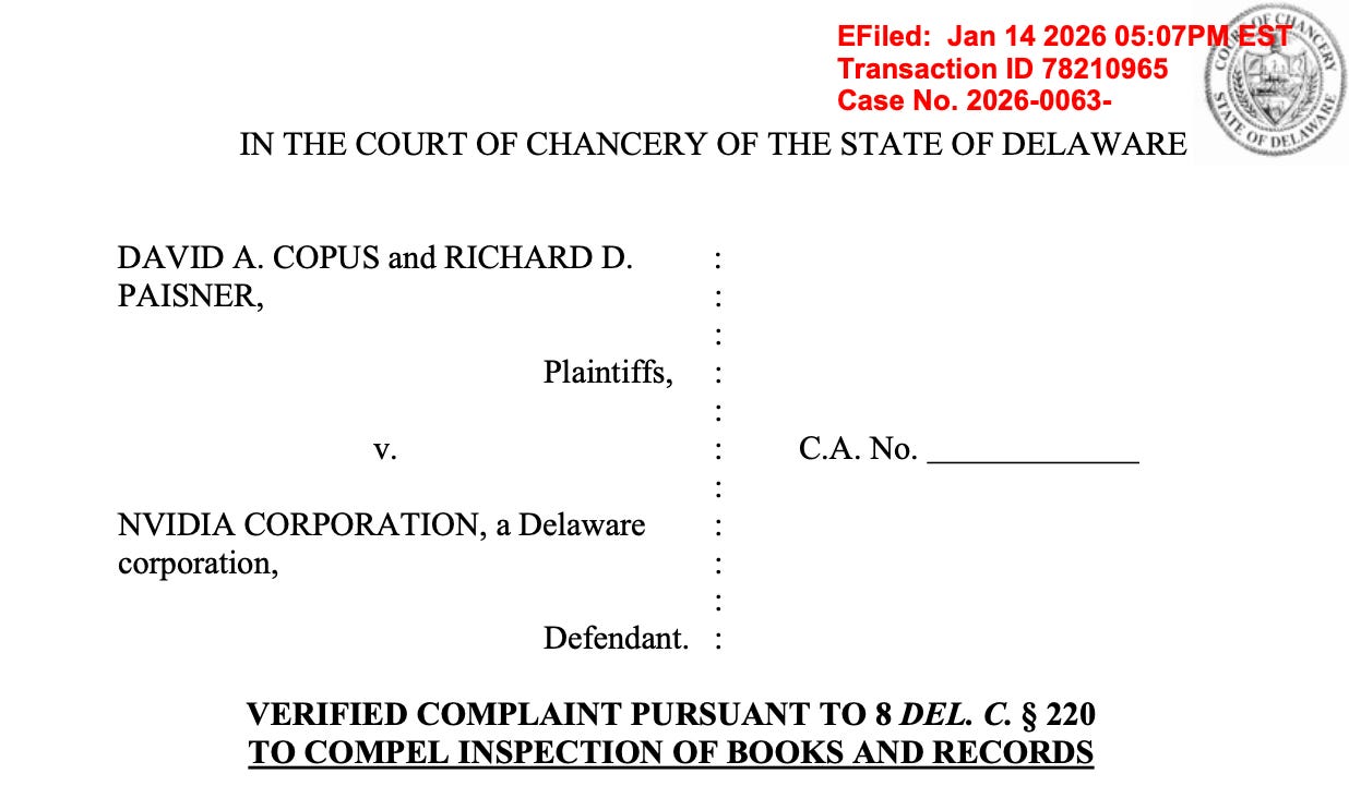 In the present action, NVIDIA stockholders David A. Copus and Richard D. Paisner, filed a verified complaint in the Delaware Court of Chancery under 8 Del. C. § 220 seeking to inspect certain books and records of NVIDIA Corporation relating to alleged agreements with the U.S. Department of Commerce (DOC) to remit revenue percentages tied to AI chip sales to China. The complaint alleges NVIDIA’s board agreed to DOC demands to pay the U.S. government a percentage of revenues in exchange for export licenses—payments plaintiffs characterize as unlawful and unsupported by statute or regulation.